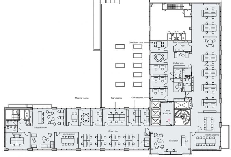 Tilassa pieniä toimistohuoneita, avotilaa, neuvottelutiloja, tiimihuoneita, keittiö ja wc-tilat. Tilat voidaan myös räätälöidä käyttäjän toiveiden mukaiseksi.