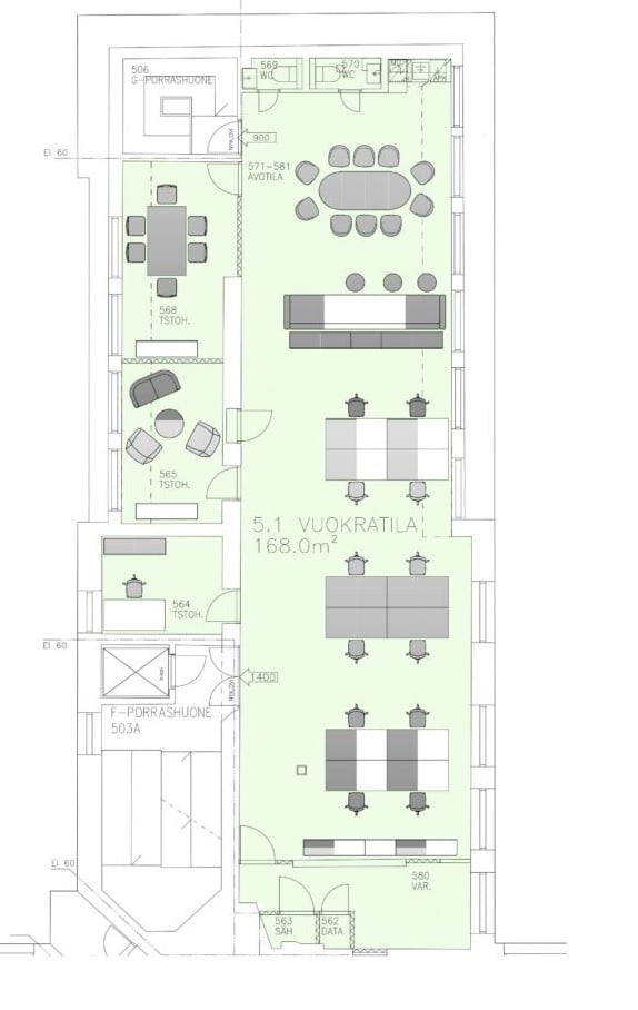 Tilassa kolme erikokoista työ- ja neuvotteluhuonetta, pieni varastotila, kaksi wc-tilaa ja pieni avokeittiö.