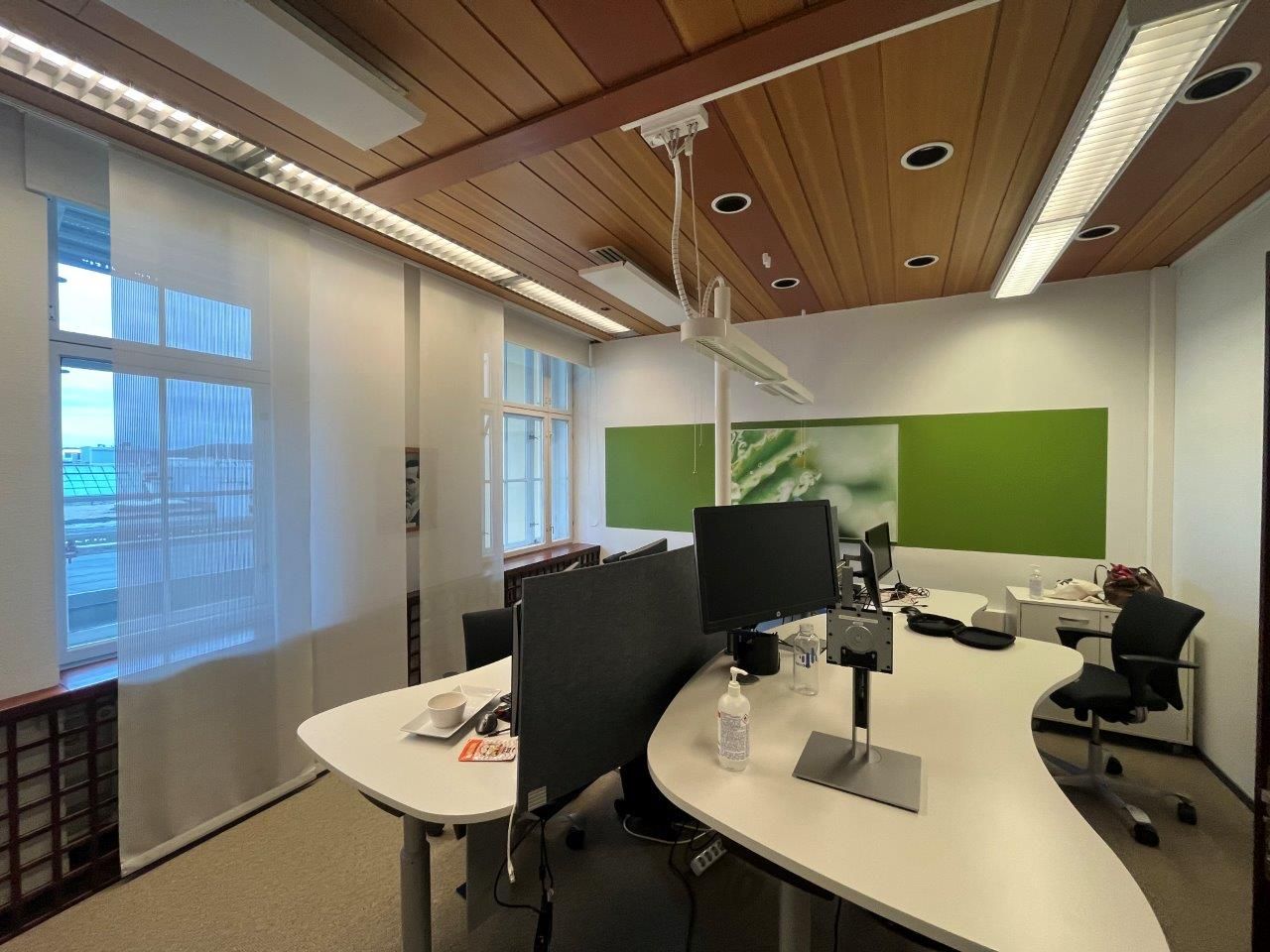 Koko 2. kerroksen kattava tilakokonaisuus on valoisa, avara ja täynnä yksityiskohtia. Tunnelmallisista erkkereistä avautuvat kauniit näkymät puistoon ja tilaan saa luotua ainutlaatuisen työympäristön.