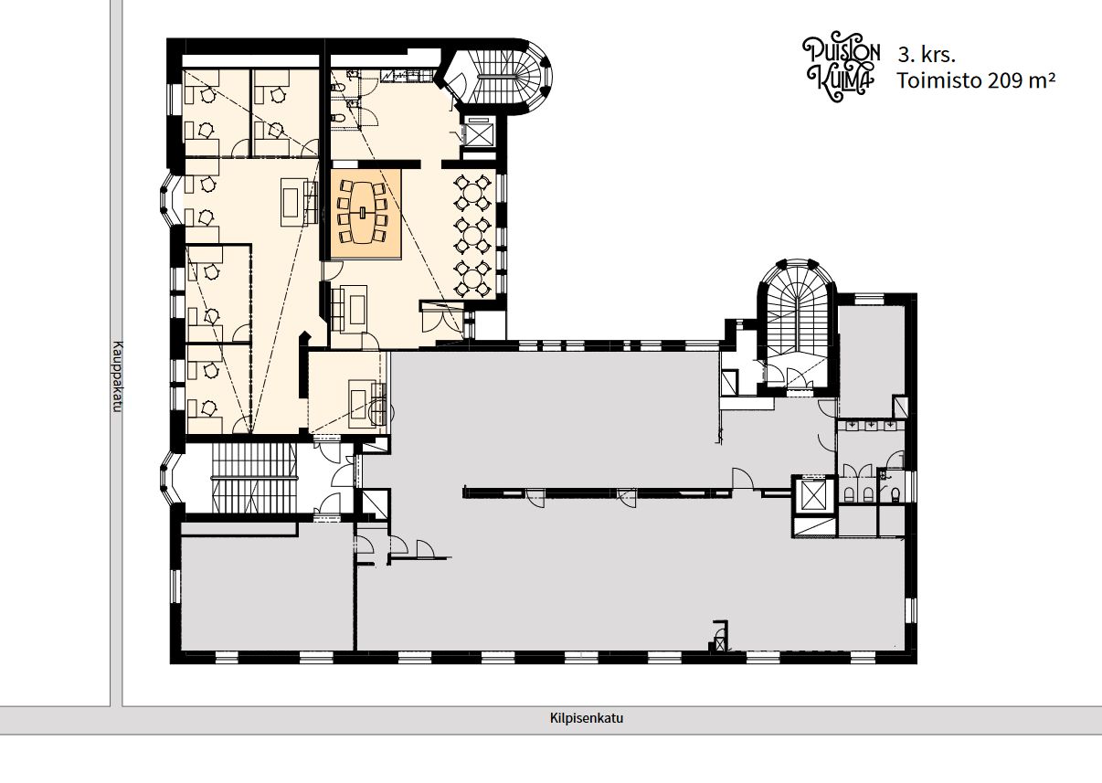 Näyttävä 3. kerroksen toimistotila, josta näkymät Kauppakadulle ja sisäpihalle. Esimerkkisovituksessa työpisteet 14:lle, iso neuvotteluhuone, sisääntuloaula sekä keittiö-, tauko- ja sosiaalitilat. Kaksi sisäänkäyntiä ja hissiyhteys. Yhdistettävissä saman kerroksen tilojen (389 m2) ja 2. kerroksen tilojen (653 m2) kanssa.