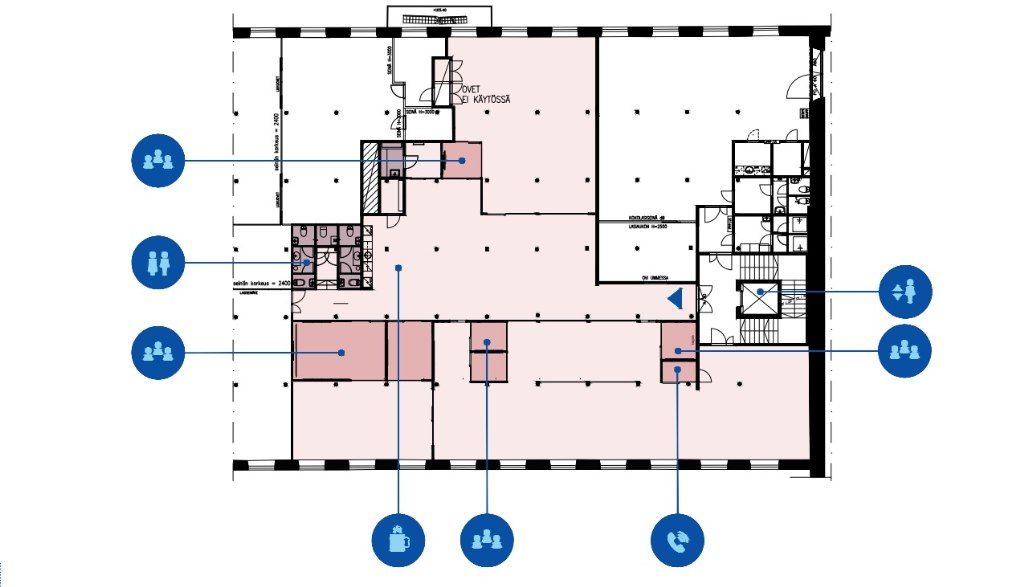 Tilassa avotilaa, huoneita, vetäytymistiloja, useampi wc ja keittiö. Tilamuutokset mahdollisia.