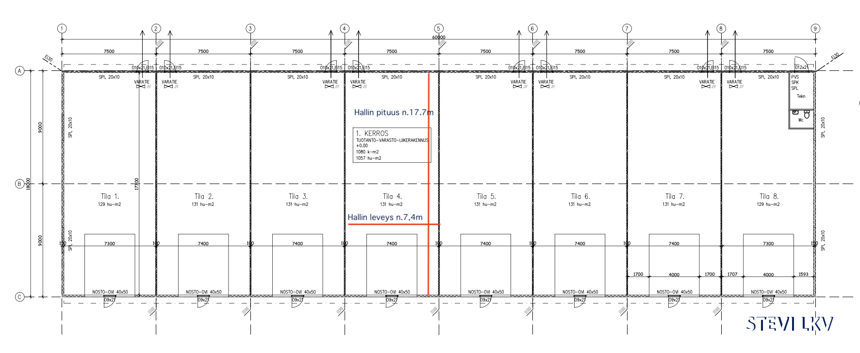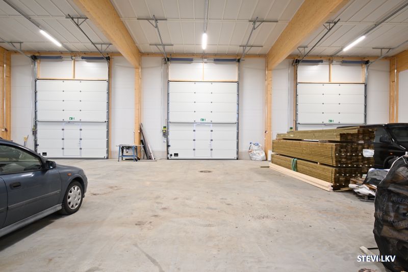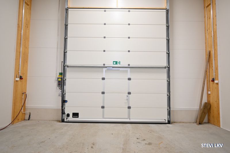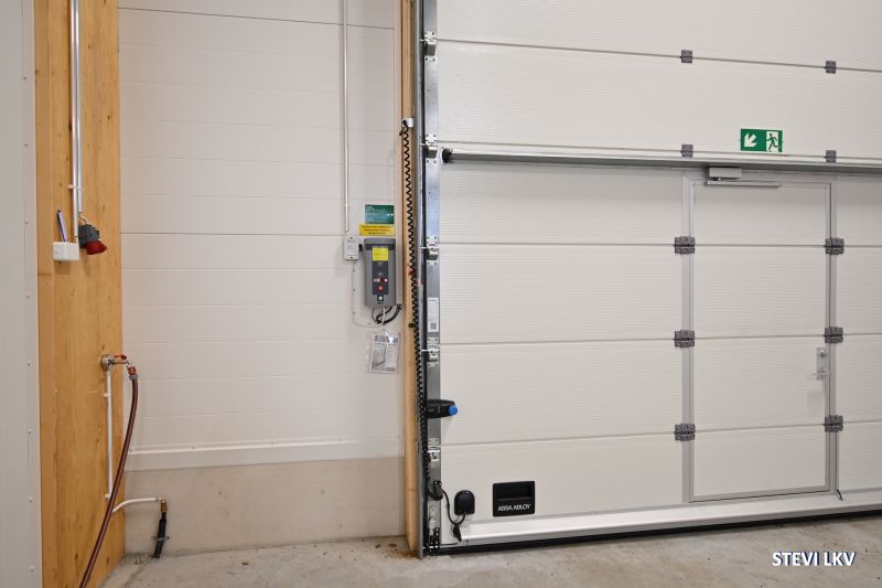 Korkea sähköinen nosto-ovi (korkeus 4,5metriä, leveys 4 metriä) ja käyntiovi.