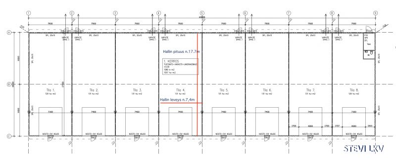 Hallin pituus n.17,7m. Tilan vapaa korkeus n.6m.