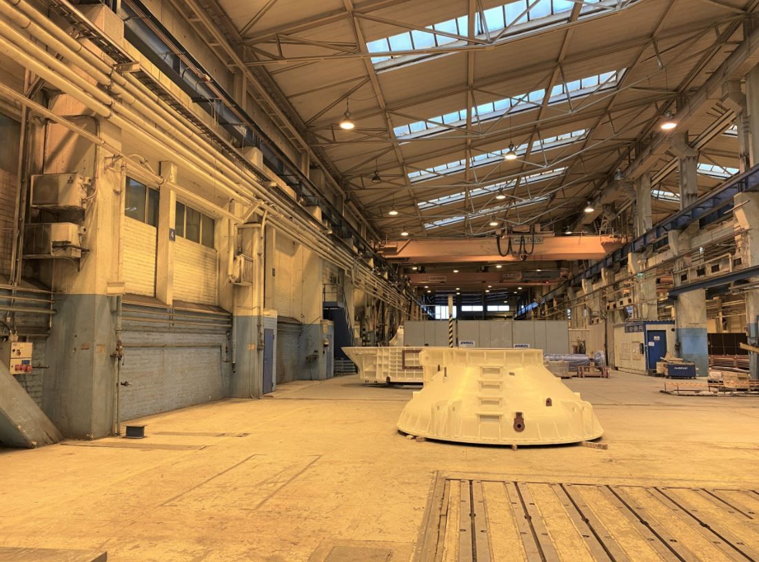 Ensimmäisen kerroksen korkeaa (n. 7,5 m) hallitilaa, jossa on kaksi järeää hallinosturia (30t ja 20t) ja iso lattiakantavuus.