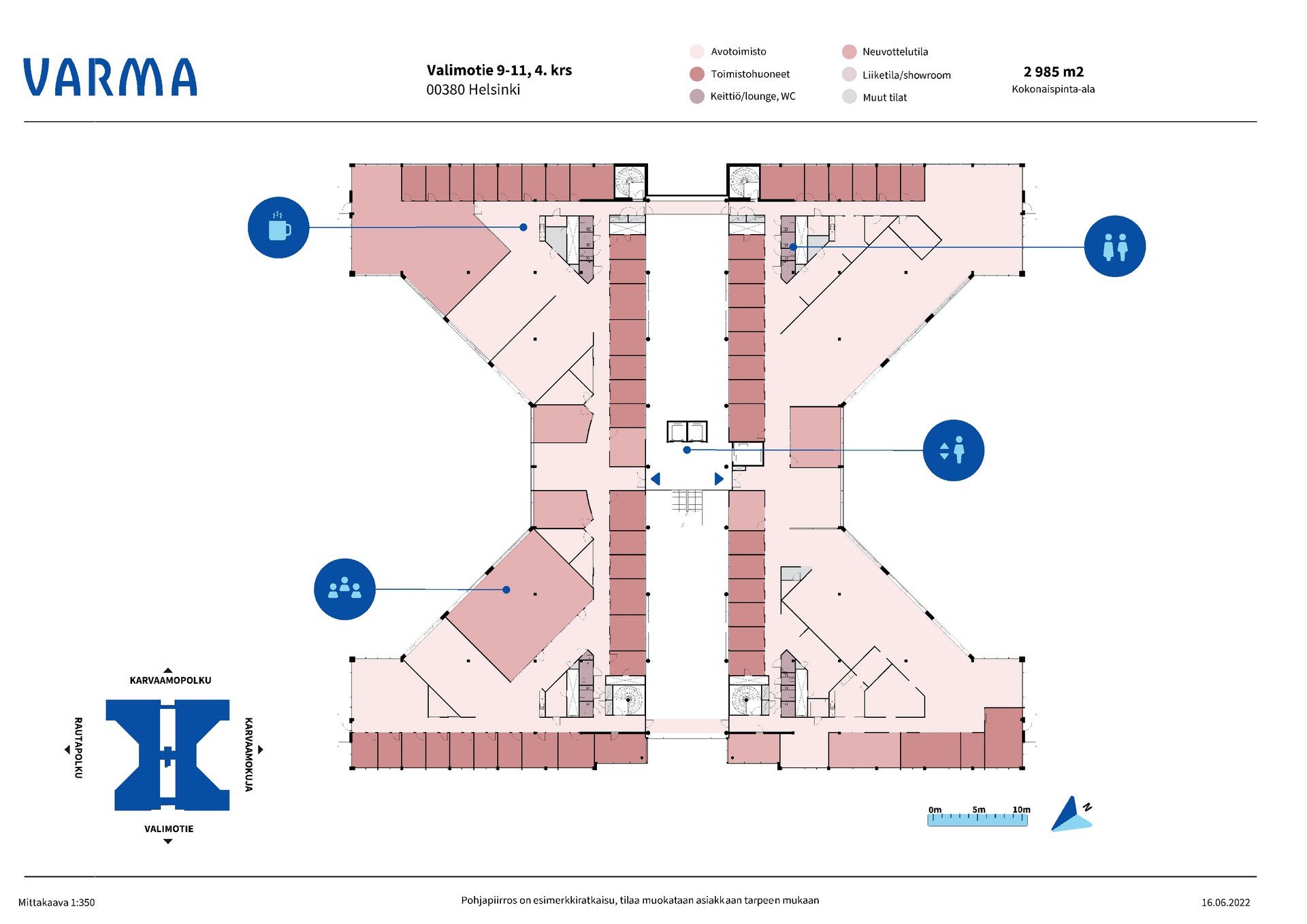 Etsitkö kustannustehokasta toimitilaa modernista ja monipuolisesta toimistotalosta? Valimotie 9-11 tarjoaa juuri sen, mitä yrityksesi tarvitsee ja paljon muuta. Pääkonttoritasoinen toimistokiinteistö sijaitsee Helsingin Piilaaksonakin tunnetulla Pitäjänmäen yritysalueella vasta valmistuneen pikaraitiotien läheisyydessä. Hiljattain uusitut aulatilat aulapalveluineen sekä talon oma ravintola ottavat saapujan kutsuvina vastaan ja palveluvalikoimaltaan erinomainen Valimotie 9-11 pitää käyttäjästään huolta. Rakennuksella on BREEAM In-Use ympäristösertifikaatti arvosanalla Very Good. Kokonainen kerros. Tilat muokataan asiakkaan toiveiden mukaiseksi.
