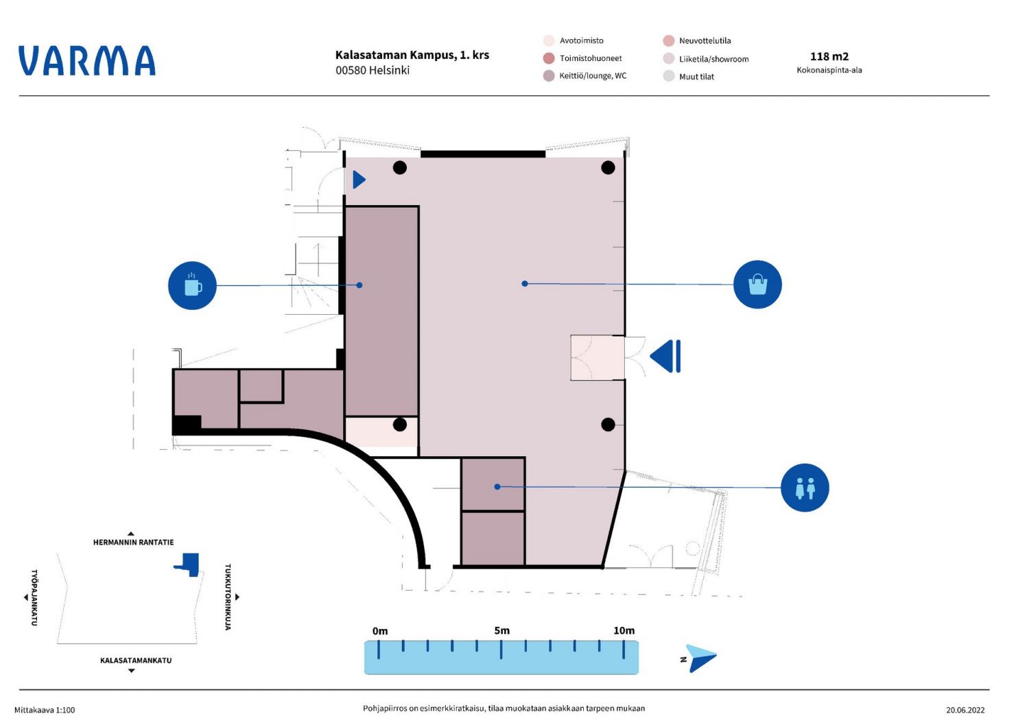Uudenaikainen ja tyylikäs toimitalo Kalasataman Kampus avasi ovensa vuonna 2019, ja se tarjoaa vuokralaisilleen huippumoderneja toimistotiloja. Arkkitehtuurin Finlandia-ehdokkuuden valmistumisvuonnaan pokanneen kiinteistön suurin vuokralainen on Kesko. Sijainti kasvavan Kalasataman keskuksessa mahdollistaa helpon kulkemisen metrolla tai talon vierestä kulkevalla uudella raitiovaunuyhteydellä (13). Viereisen kauppakeskus REDIn palvelut helpottavat arkea toimistopäivinä. Korkeaa ja avaraa liiketilaa kasvavan Kalasataman ytimessä. Tilassa ei ole ollut aiempia vuokralaisia, vaan kaikki on uudenveroista ja muokataan käyttäjän tarpeisiin sopivaksi. Liiketilassa on omat WC:t ja takatilat. Alueella runsaasti asuinkiinteistöjä ja metroasema vieressä, joten asiakasvirta on taattu. Tila sopisi hyvin esimerkiksi myymäläkäyttöön. Isot ikkunat lattiasta kattoon ja erinomainen näkyvyys vilkkaalle Hermannin rantatielle.