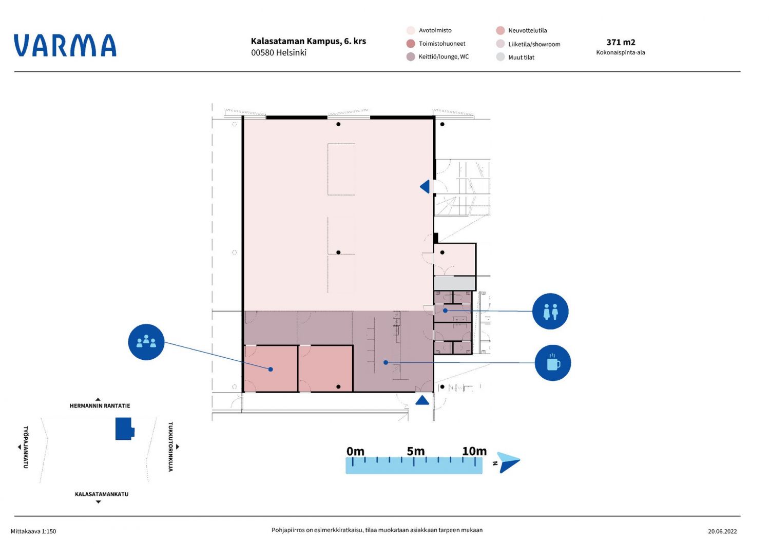 Uudenaikainen ja tyylikäs toimitalo Kalasataman Kampus avasi ovensa vuonna 2019, ja se tarjoaa vuokralaisilleen huippumoderneja toimistotiloja. Arkkitehtuurin Finlandia-ehdokkuuden valmistumisvuonnaan pokanneen kiinteistön suurin vuokralainen on Kesko. Sijainti kasvavan Kalasataman keskuksessa mahdollistaa helpon kulkemisen metrolla tai talon vierestä kulkevalla uudella raitiovaunuyhteydellä (13). Viereisen kauppakeskus REDIn palvelut helpottavat arkea toimistopäivinä. Uutta, siistiä toimistotilaa, joka muokataan vuokralaisen toiveiden mukaiseksi. Oma keittiö ja useampi WC sekä neuvotteluhuoneita. Kerroksiin tulee paljon luonnonvaloa suurten ikkunoiden, avoimen keskilaivan ja kattoikkunarakenteen kautta. Tilan ikkunat Hermannin rantatien suuntaan. Hyvin varustellusta modernista kiinteistöstä löytyy oma ravintola, aulapalvelu, hyvät kokoustilat ja auditorio sekä oma parkkihalli.