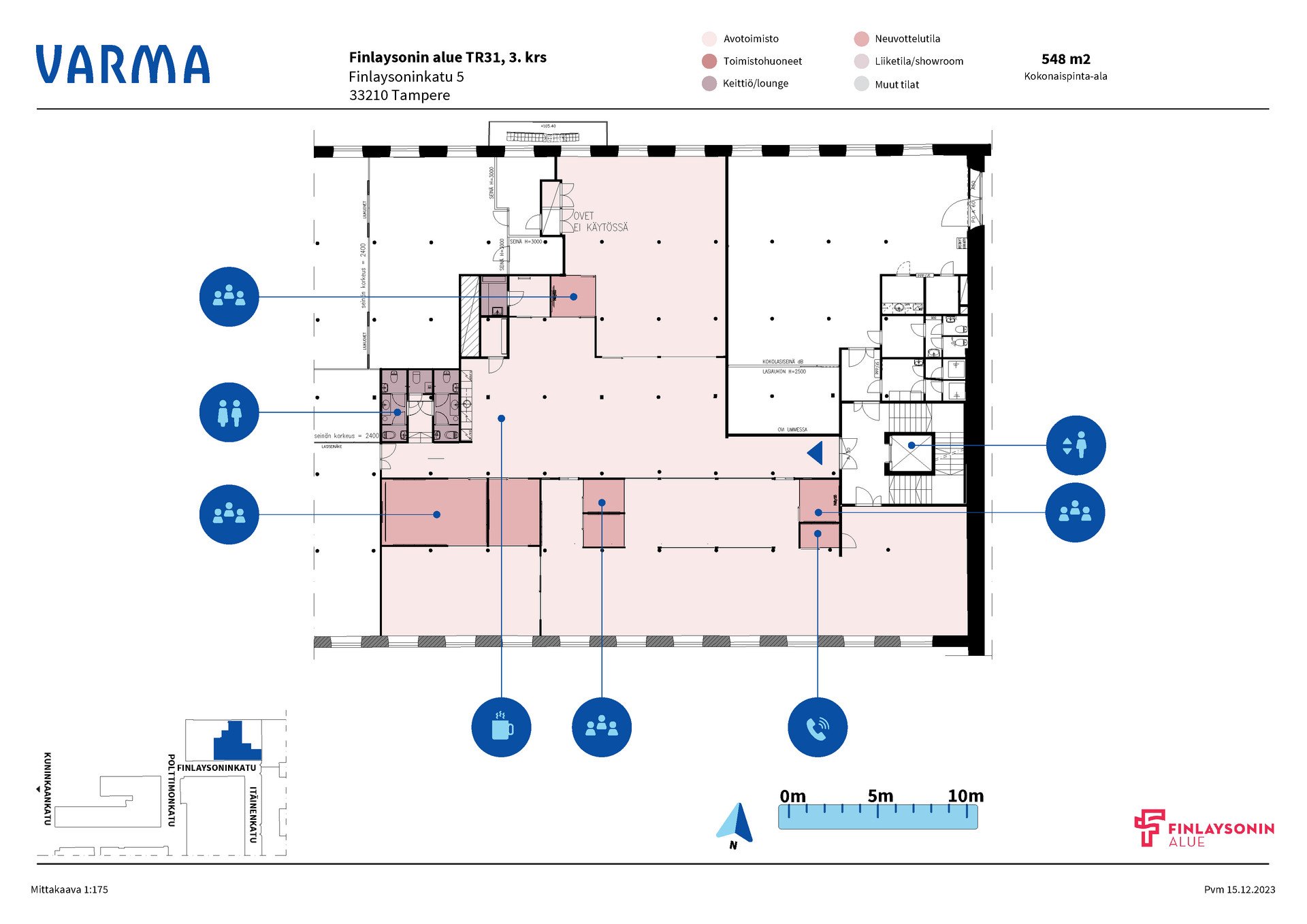 Perinteikäs Finlaysonin alue on vireä liike-elämän, vapaa-ajan ja kulttuuritapahtumien keskus, jossa toimivissa yli 100 yrityksessä työskentelee ja asioi päivittäin tuhansia ihmisiä. Alueen useat ravintolat ja kahvilat mahdollistavat maukkaat lounas- ja kahvihetket. Finlaysonin alueen vanhat tehdasrakennukset tarjoavat yrityksellesi uniikin toimintaympäristön Tammerkosken maisemissa. Alueen rakennukset ovat BREEAM In-Use -ympäristösertifioituja arvosanalla Very Good. Finlaysonin alue on helposti saavutettavissa omalla autolla, julkisin kulkuvälinein ja kevyellä liikenteellä. Keskustori ja rautatieasema ovat kävelymatkan etäisyydellä. Toimistotila osoitteessa Finlaysoninkatu 5.