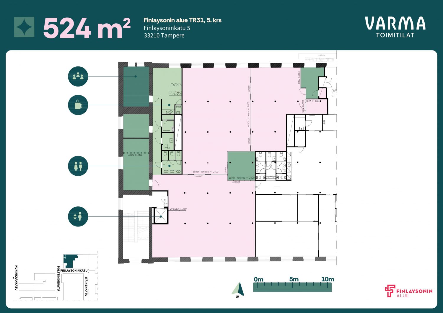 Perinteikäs Finlaysonin alue on vireä liike-elämän, vapaa-ajan ja kulttuuritapahtumien keskus, jossa toimivissa yli 100 yrityksessä työskentelee ja asioi päivittäin tuhansia ihmisiä. Alueen useat ravintolat ja kahvilat mahdollistavat maukkaat lounas- ja kahvihetket. Finlaysonin alueen vanhat tehdasrakennukset tarjoavat yrityksellesi uniikin toimintaympäristön Tammerkosken maisemissa. Finlaysonin alue on helposti saavutettavissa omalla autolla, julkisin kulkuvälinein ja kevyellä liikenteellä. Keskustori ja rautatieasema ovat kävelymatkan etäisyydellä. Toimistotilaa kolmannen kerroksen kolmeen suuntaan avautuvilla näkymillä. Tila on tällä hetkellä jaettu kolmeen suurempaan toimistoalueeseen, joiden lisäksi on muutama neuvotteluhuone. Oma keittiö ja useampi WC. Tilaratkaisu ja pintojen päivitys suunnitellaan vuokralaisen tarpeen mukaan. Tilassa on kauniit vanhat ikkunat.