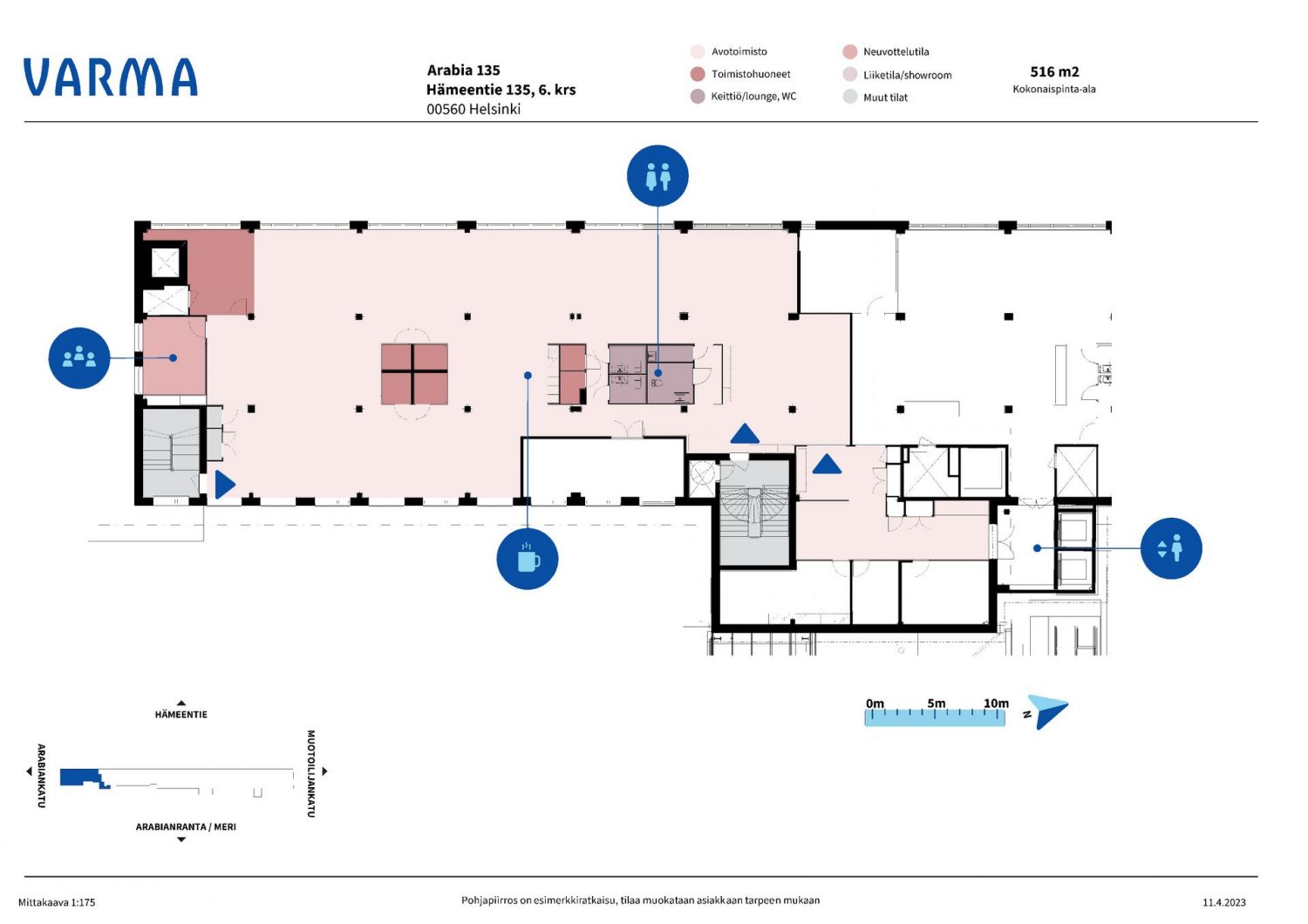 Arabia 135 -tehdaskortteli Helsingin Toukolassa tunnetaan luovien ideoiden ja toteutusten kohtauspaikkana ja osana suomalaisen designin historiaa. Entinen keramiikkatehdas on jo vuosia toiminut modernina design-liikkeiden, pääkonttoreiden ja oppilaitosten yhteisönä, mutta nyt käynnissä on huikea uudelleensyntyminen. Eri asteista ja tyylistä vuokrattavaa tilaa korttelissa on kaikenlaisille yrityksille. Valoisa ja avara juuri remontoitu toimistotila. Hienot näkymät Toukolan suuntaan ja Vanhankaupunginlahdelle. Huom. pohjakuvassa näkyy isompi kokonaisuus, josta vasen puoli on tätä vuokrattavaa tilaa.