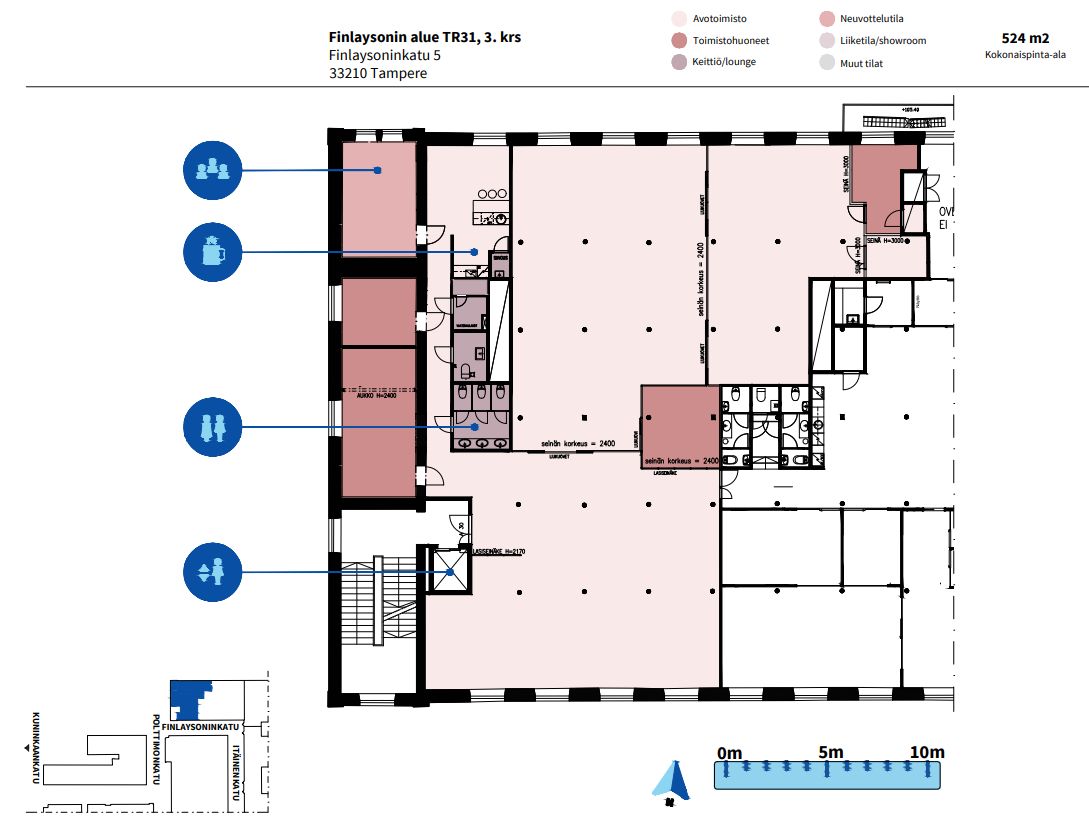 Tilassa on avotoimistoa, muutamia työhuoneita/ neuvotteluhuoneita, keittiö ja kaksi wc-tilaa.