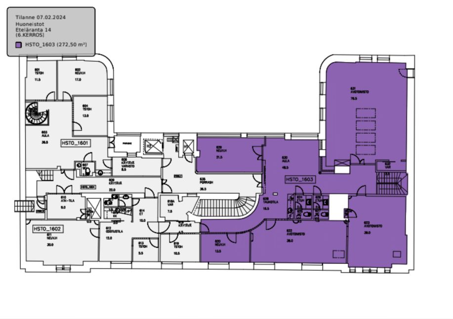 Tämä 272,5 m² toimistotila sijaitsee kiinteistön 6. kerroksessa. Tila koostuu aulatilasta, viidestä huoneesta sekä omista sosiaalitiloista. Tilassa on myös oma pieni varasto. Toimisto on erittäin siistissä kunnossa, siinä on parkettilattiat, jalopuuovet ja hieno merimaisema. Tila on yhdistettävissä 5. kerroksen 235 m² tilaan sisäporrasyhteydellä, jolloin kokonaisneliöt ovat n. 507,5 m².