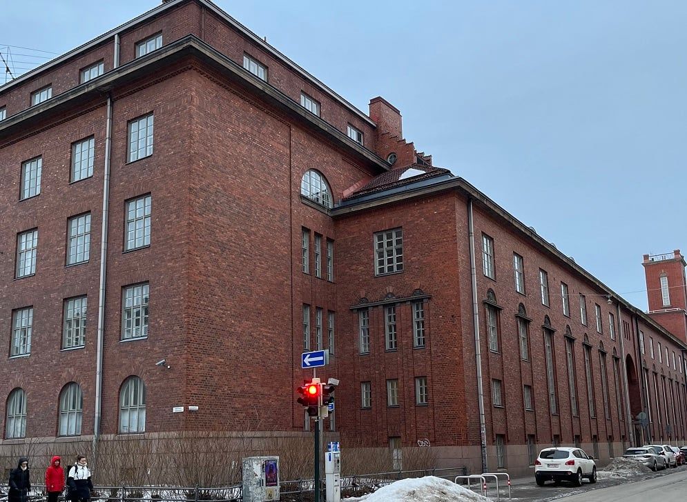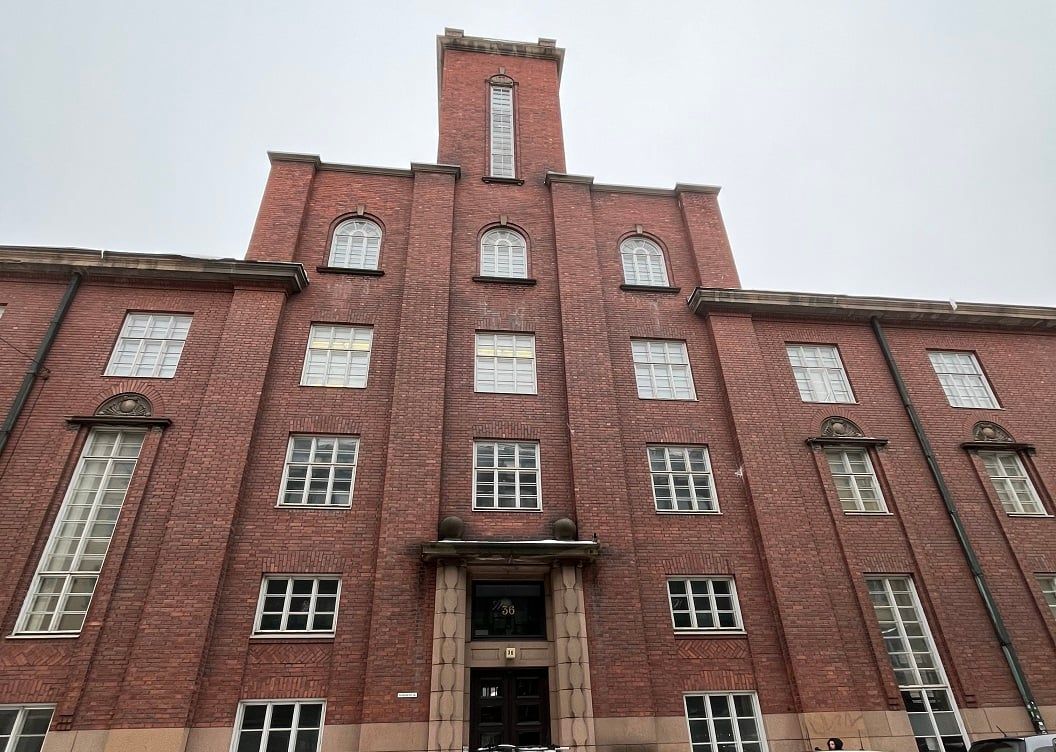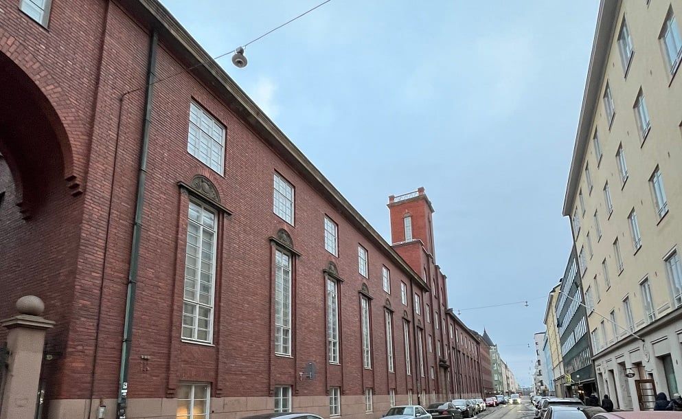 Näyttävä punatiilinen rakennus rauhallisella mutta keskeisellä sijainnilla Helsingin Kampissa.