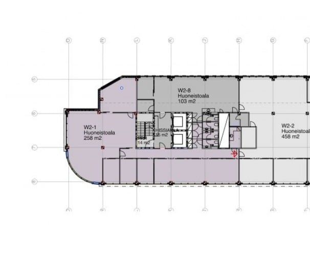Tämän toisen kerroksen toimiston kaarevaa päätyä ja seinustaa vuoraavat ikkunat, jotka päästävät sisään runsaasti valoa. Monipuolinen tilajako mahdollistaa huonetoimisto-, monitila-, tiimi- tai avotyöskentelyn itsenäisesti tai porukalla. Tilassa on oma keittiönurkkaus sekä wc:t.