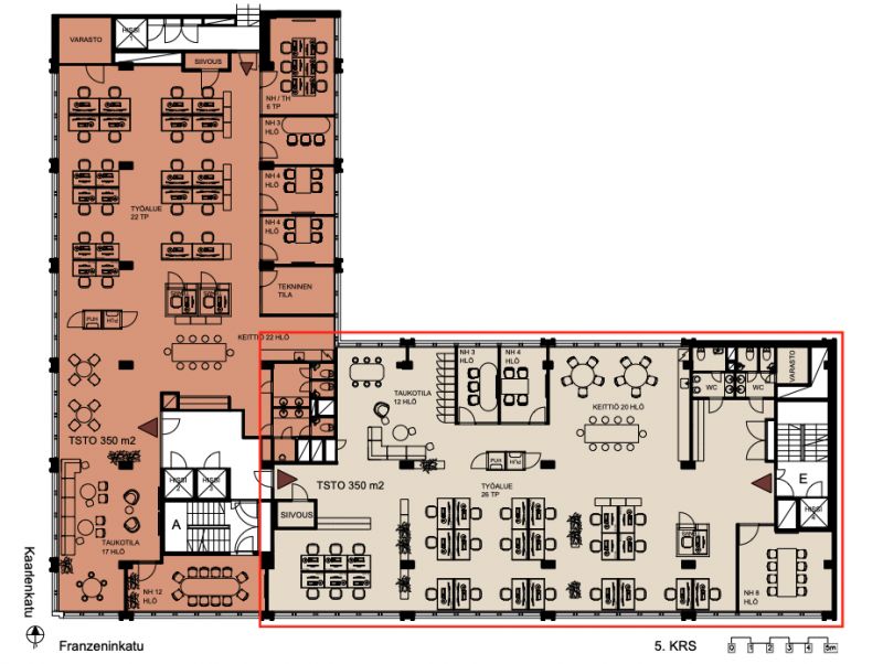 Tämä 350m2 toimistotila sijaitsee kiinteistön 5. kerroksessa. Toimistossa on avotilaa, neuvotteluhuoneita sekä omat keittiö- ja wc-tilat.