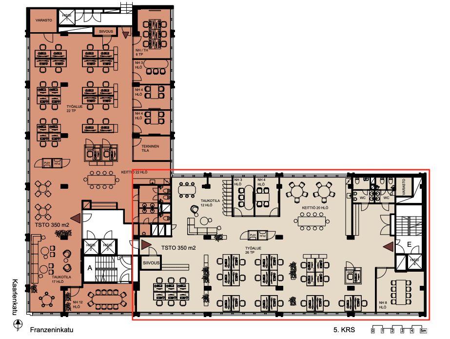 Tämä 350 m² toimistotila sijaitsee kiinteistön 5. kerroksessa. Toimistossa on avotilaa, neuvotteluhuoneita sekä omat keittiö- ja wc-tilat.