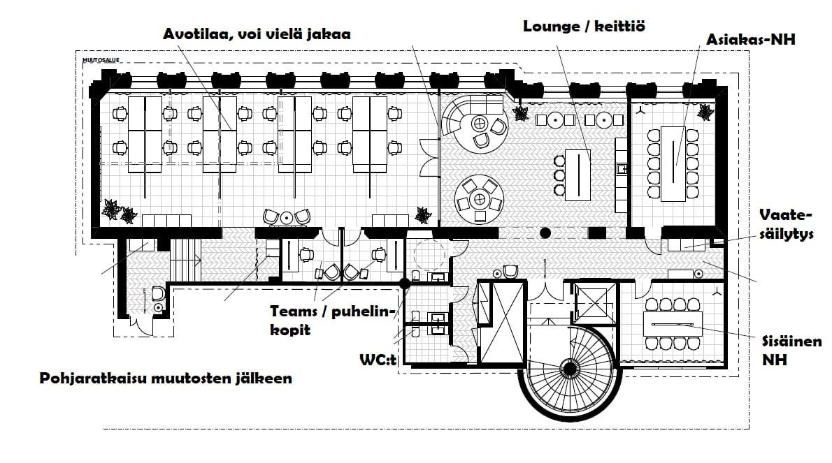 Kluuvikatu 5 osoitteessa hienossa 1800-luvun lopun rakennuksen osassa on vapaana kaunis 299,5 m2:n toimisto. Tai ei se vielä kaunis ole mutta pian on, suunnitelmat ovat valmiina ja remontti käynnissä.