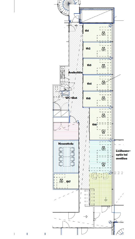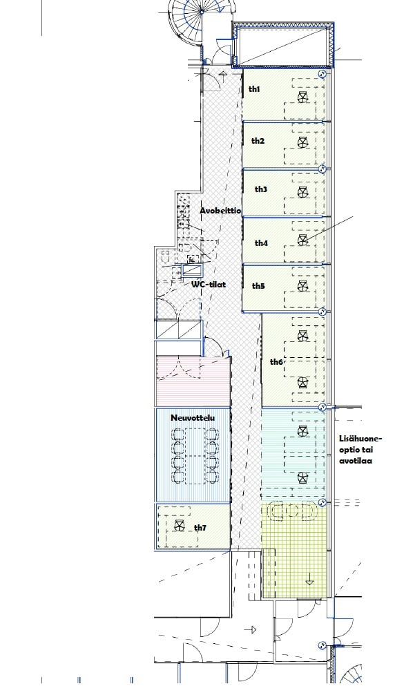 Vapaana toimistotila Käpylästä (200 m2). Tilassa nykyisellään on kuusi (6) ikkunallista huonetta ja yksi (1) ikkunaton huone vaikka Teams-huoneeksi. Huonemäärää on jopa hieman mahdollista lisätä jos tulevan käyttäjän tarve sitä edellyttää. Eli pohjaa voidaan remontoida tarvittaessa tulevan käyttäjän toiveitten mukaan. Ohessa muutama havainnekuva.