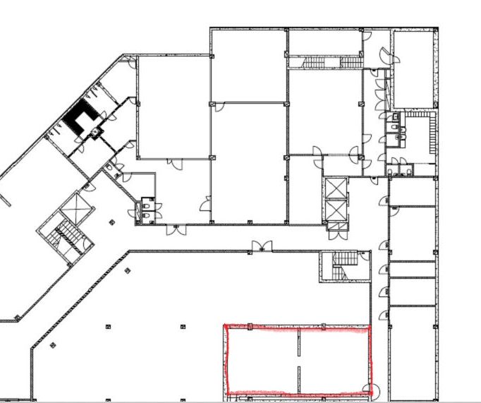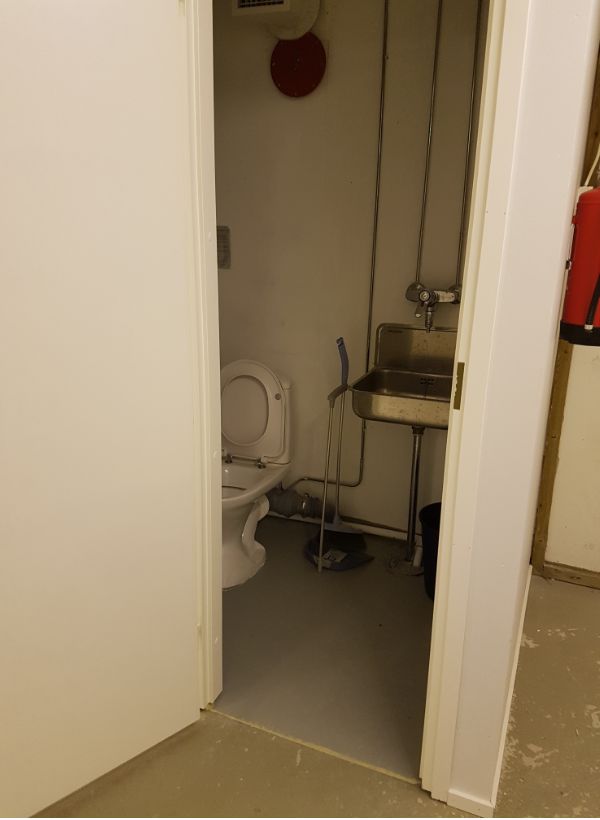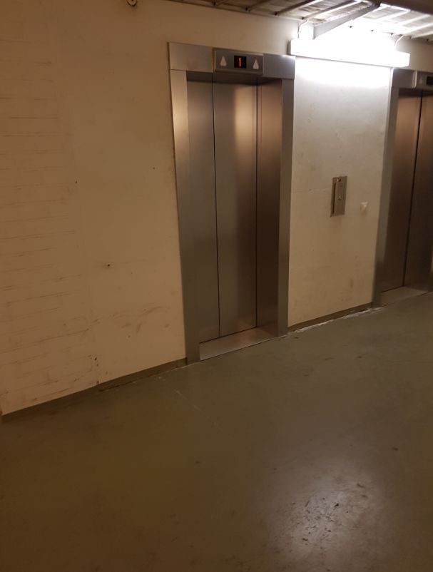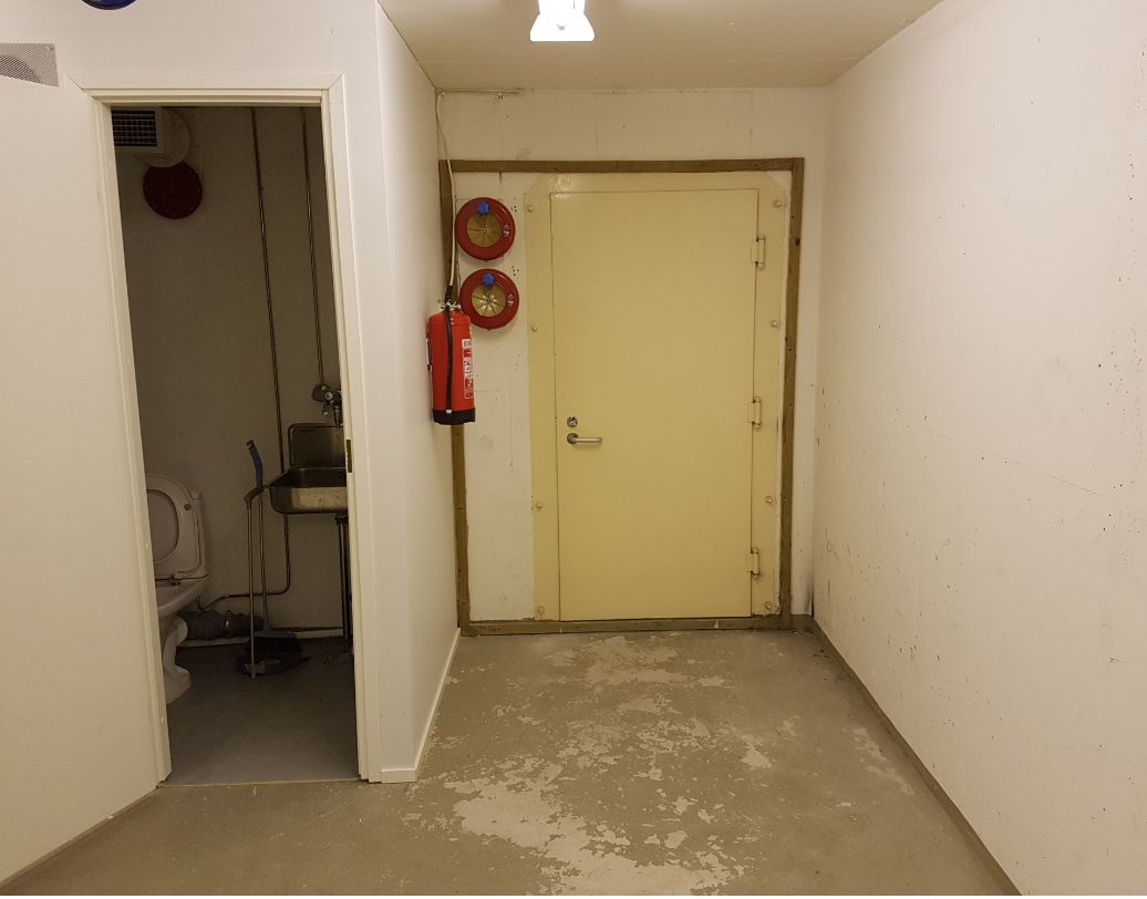 (väestönsuojatila). Tilaan kulku henkilöhissin kautta.