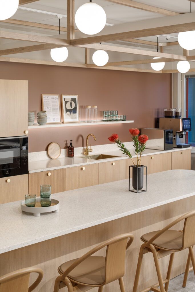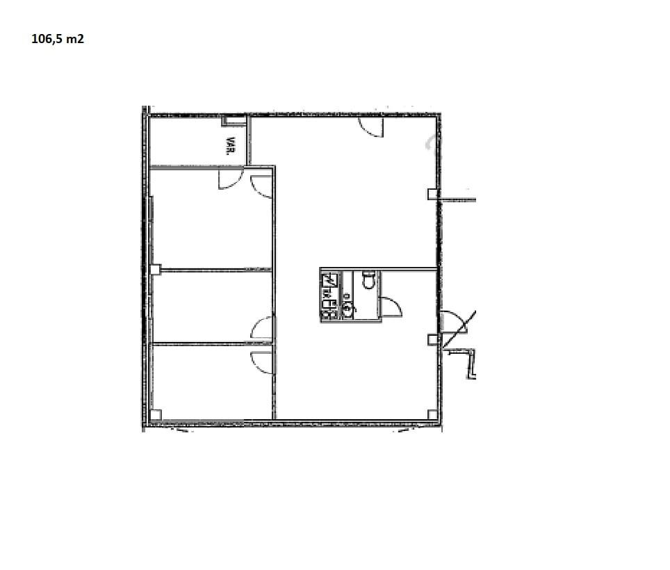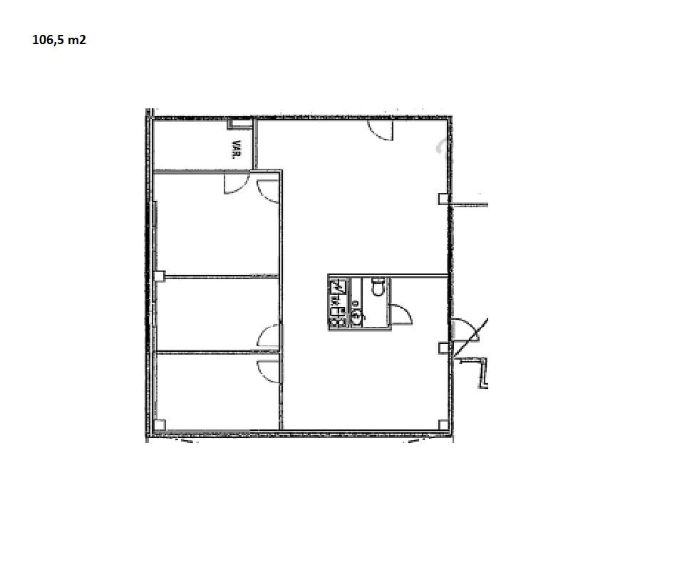 Tilassa kolme huonetta työskentelyyn tai neuvotteluihin, hieman avotilaa, avokeittiö ja oma WC.