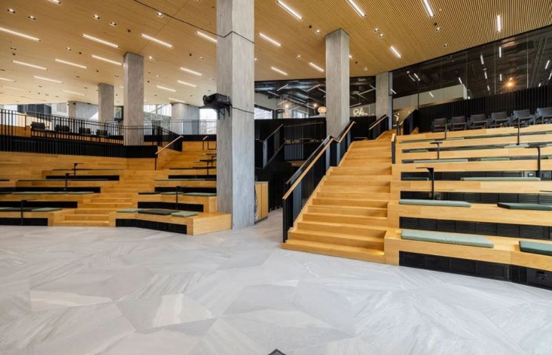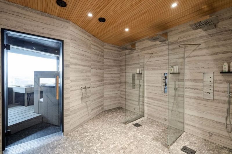 Talossa ravintola, neuvottelukeskus, saunaosasto, autohalli ja pyöräparkki sekä yhteiset sosiaalitilat.