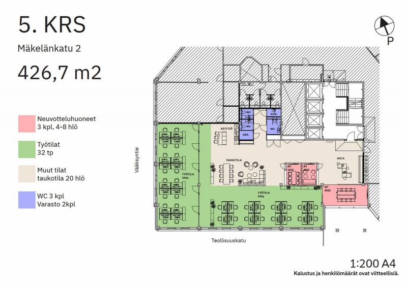 Vuokrattavissa 5. kerroksen siisti 426m2 toimistokokonaisuus. Pohjakuva on suuntaa antava ja tilat on muokattavissa vuokralaisen tarpeiden mukaan.