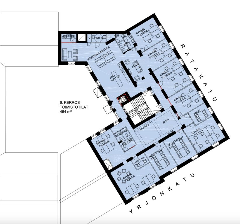 Tämä 454 m² tila sijaitsee kiinteistön 6. kerroksessa. Tilat ovat betonilla, ja ne viimeistellään uudelle vuokralaiselle. Valmistuminen min. n 2,5kk ajassa. Kuvat ovat havainnekuvia kiinteistön tiloista.