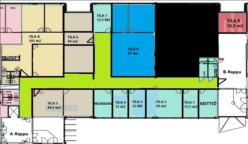 Vuokrattavana pientoimistotilaa kiinteistön 2. kerroksessa sijaitsevasta toimistohotellista. Vuokrattavia tilakokoja on väliltä 12 m² - 103 m². Keittiö- ja wc-tilat ovat vuokralaisten yhteiskäytössä. Vuokraan sisältyy mm. sähkö, siivous, internet ja neuvottelutilan käyttö. Kuvat ovat pientoimistoalueelta.