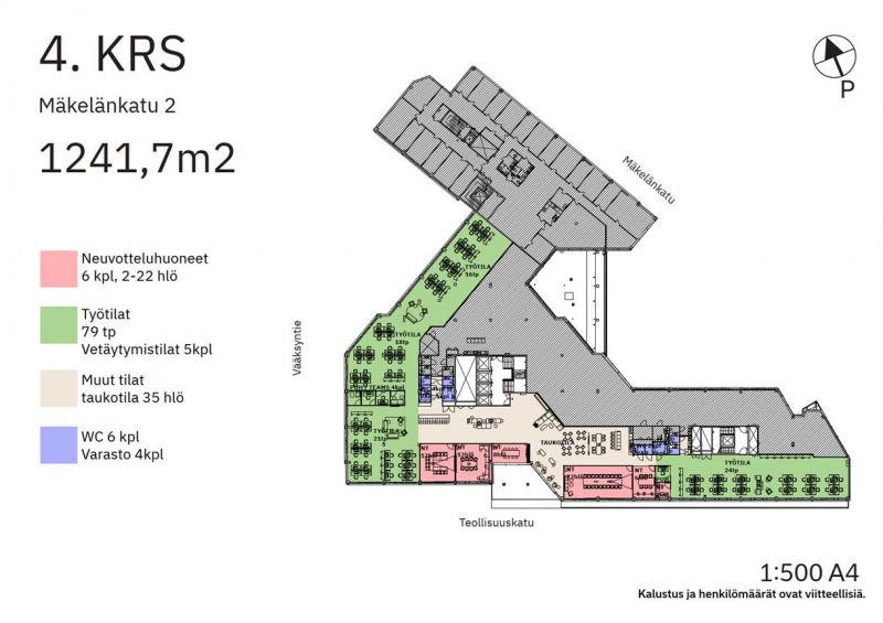 Vuokrattavana kiinteistön 4. kerroksen valoisa toimistotila 1241,7 m². Tila voidaan suunnitella vuokralaisen tarpeiden mukaan. Tilaan voidaan yhdistää viereinen 712,7 m²:n toimisto, jolloin kokonaisuus on 1954,6 m²:tä.