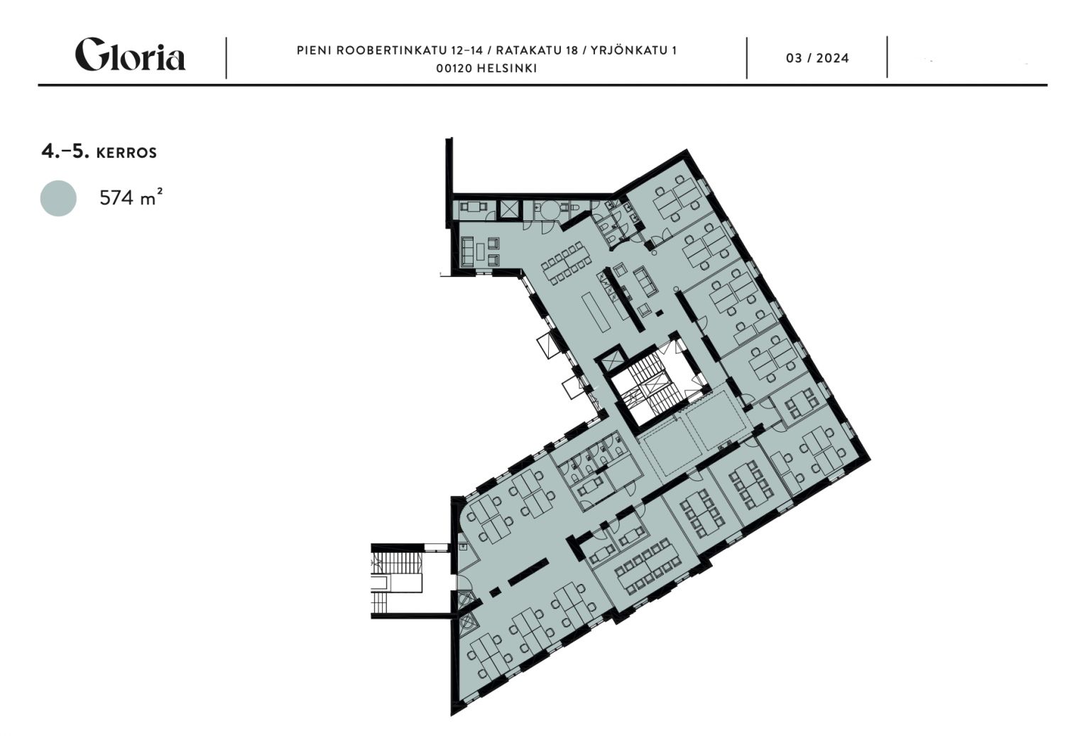 Glorian korttelin ytimessä, vahvojen kiviseinien suojissa sijaitsee yksi koko kohteen upeimmista piirteistä: atrium-henkinen sisäpiha, joka kutsuu leppoisaan oleskeluun vehreine istutuksineen ja tunnelmallisine valaistuksineen. Inspiroiva piha toimii koko kiinteistön ihmisten yhteisenä kohtaamis- ja virkistäytymiskeitaana sekä oivallisena paikkana vapaamuotoisemmalle ideoinnille ja työnteolle.