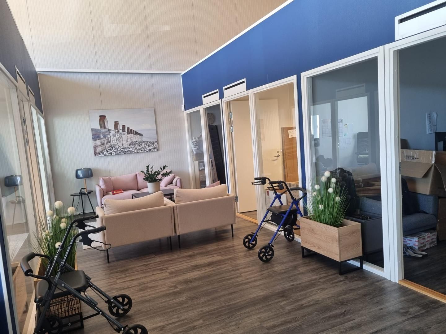 Isompi 300 m2 tila on läpi talon tila. Sinne on tehty kevytrakenteisia lasielementtisiä työhuoneita. Sisään tultaessa on kuusi työhuonetta, 2 WC-tilaa, taukotila ja avotilaa. Keskihallissa on iso neuvottelutila sekä kaksi työhuonetta. Hallin päässä on nosto-ovi, lattiakaivo ja pieni parvi. Työhuoneet voi myös purkaa mikäli tarvitsee enemmän avotilaa.
