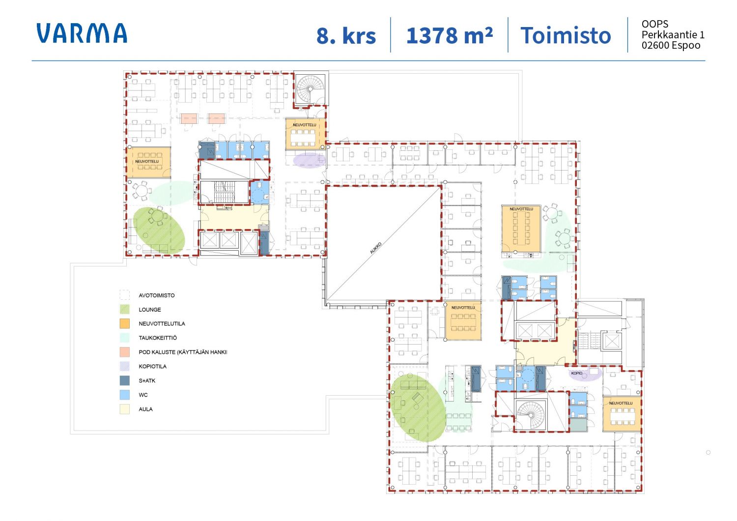 OOPS sijaitsee yhdellä pääkaupunkiseudun vetovoimaisimmista työpaikka-alueista Espoon Leppävaaran kupeessa. 2021 loppuvuodesta valmistuneet talot sijaitsevat Leppävaaran Hatsinanpuistossa Monikonpuron ja toimivien liikenneyhteyksien äärellä Kehä I:n, pääjunaradan ja Raide-Jokerin risteyksessä. Upea moderni toimistotila, josta avautuvat kahdeksannen kerroksen avarat maisemat moneen suuntaan. Tilassa on kaikki nykyaikaiset fasiliteetit, joita onnistunut toimistoelämä vaatii mm. useita neuvottelu- ja työtiloja, omat wc-tilat ja useampi taukokeittiö. Tilan keskellä avautuu valokuilu, joka tuo ilmavutta ja valoa myös toimiston sisempiin osiin. Tervetuloa tutustumaan.