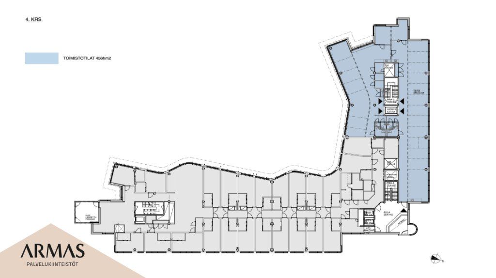 Vuokrataan laadukasta saneerattua toimistotilaa Herttoniemestä, vuokrattava tila on 4. kerroksen 456 m² toimistotila. Tila soveltuu toimistokäytön lisäksi opetus-. lääkärinvastaanotto,- ja kuntoutuskäyttöön.