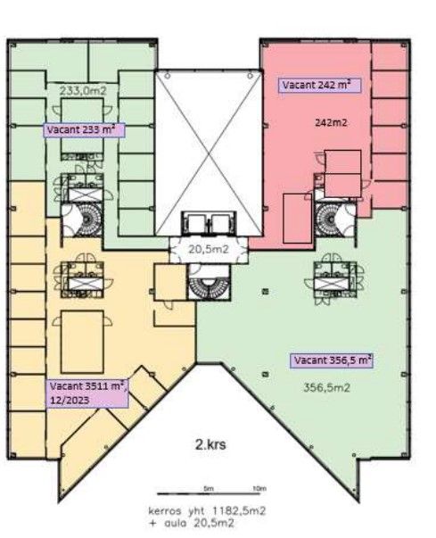 Vapaana kiinteistön 2. kerroksessa 233m2 huonetoimistotila. Tila on helposti yhdistettävissä muiden saman kerroksen vapaiden tilojen kanssa.