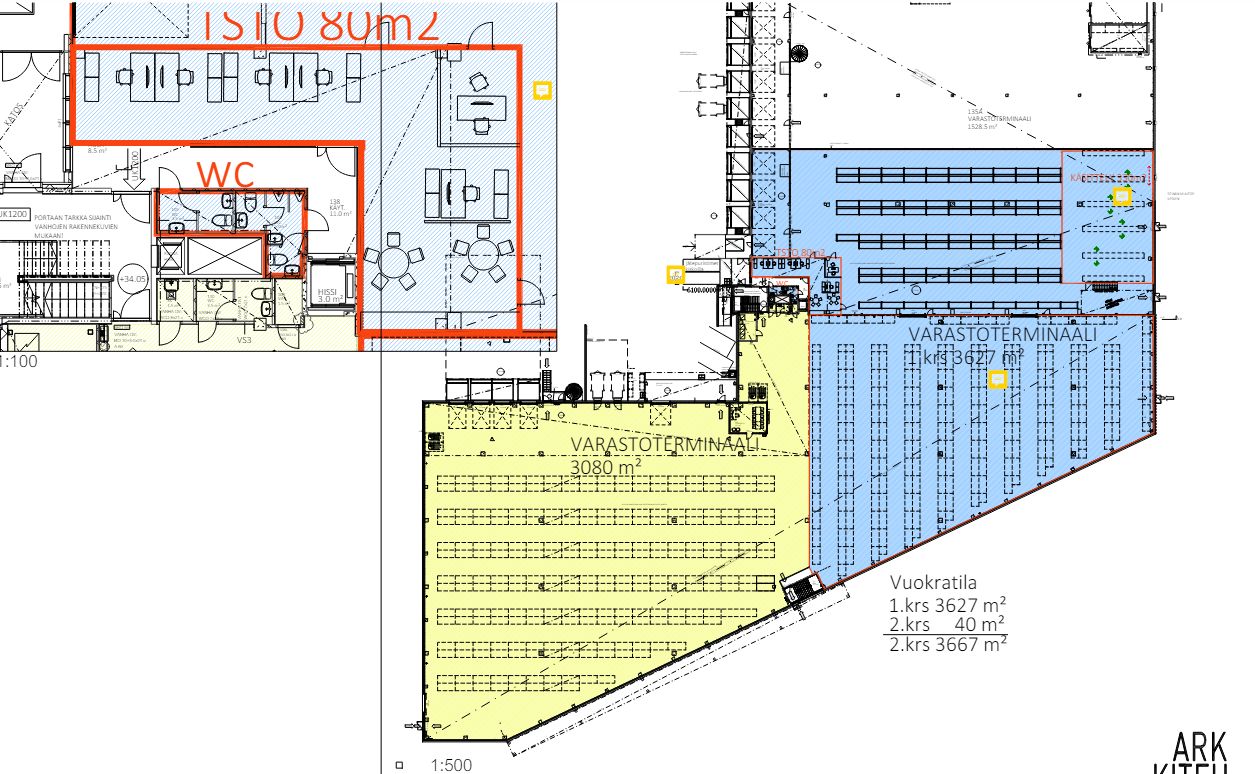 Vuokrattavana n. 5000 m2 uutta, 11,7 m korkeaa varastotilaa ja n. 1700 m2 6m korkeaa varastotilaa ja n. 600 m2:n parvi, jossa on toimistotiloja. Kokonaisuudessaan vuokrattavaa tilaa on n. 7.300 m2.