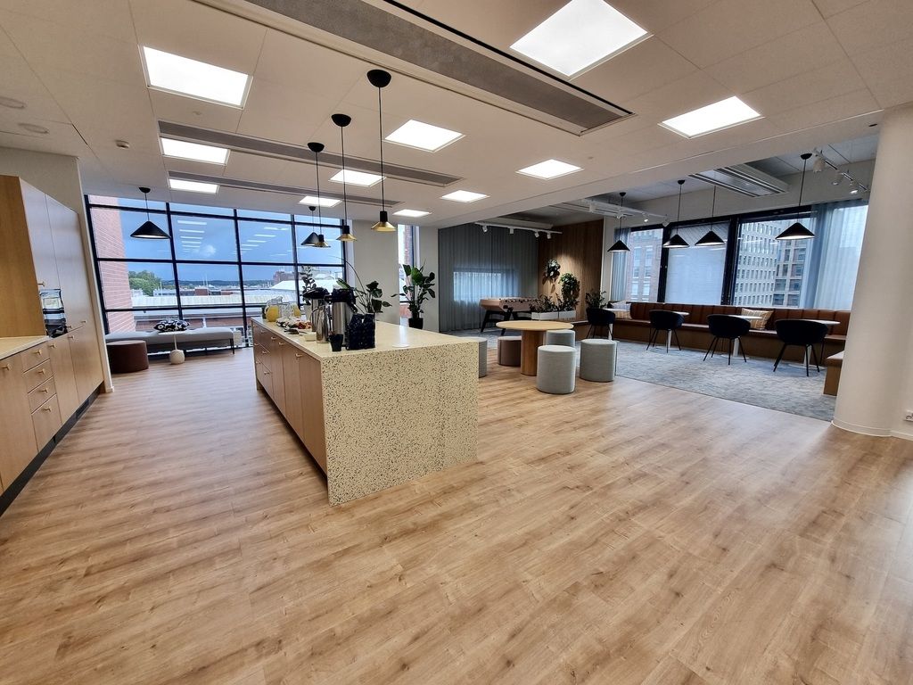 Kiinteistön 3. kerroksessa on 1107 m² toimistotilaa, joka on mahdollista jakaa 410 m² ja 695 m² kokoisiin osiin. Kuvat ovat yleiskuvia kiinteistön tiloista ja mallitoimistosta.