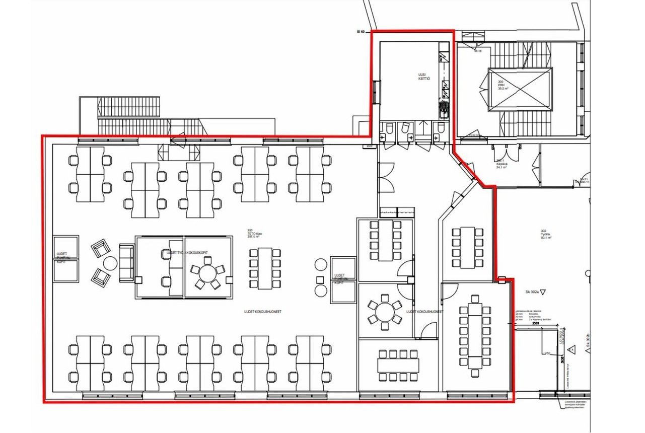 Tilaan on suunniteltu toteuttavaksi avotoimistoalueita ja erikokoisia kokous-/projektihuoneita. Tilaratkaisuja voidaan toki vielä muokata käyttäjän tarpeiden mukaiseksi.