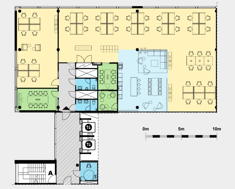 Vuokrattavana neljännen kerroksen laadukasta, avaraa toimistotilaa, jossa avotilaa ja erikokoisia tiimihuoneita.
