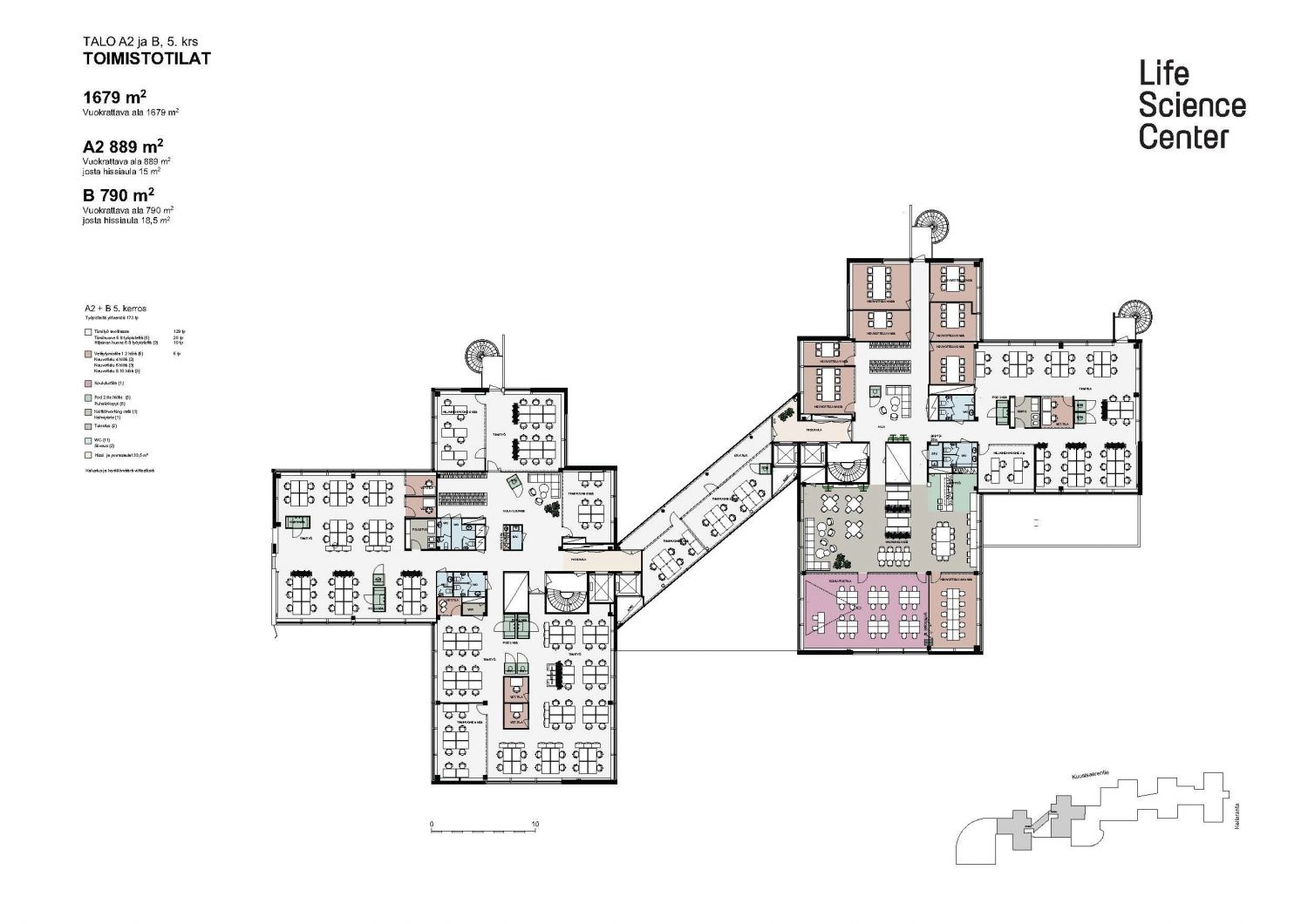 Isommalle käyttäjälle tilat tehokkaasti samaan tasoon. Kahden talon tiloja lasikäytävällä yhdistävä kokonaisuus. 1679 m2. Tilajaon mahdollinen muokkaus ja pintojen uusiminen suunnitellaan yhdessä tulevan käyttäjän kanssa.