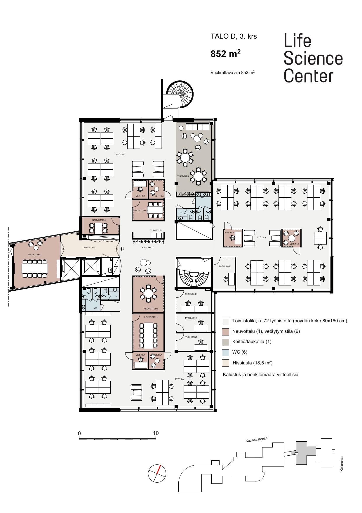 Keilaniemen Life Science Centerin D-talon kolmannessa kerroksessa olisi tämä 852-neliöinen toimistotila. Tähän toimistotilaan voidaan räädälöidä juuri teidän tarpeiden mukaiset ratkaisut eli tila modernisoidaan ja viimeistellään tulevan käyttäjän työnteon tarvetta vastaavaksi.