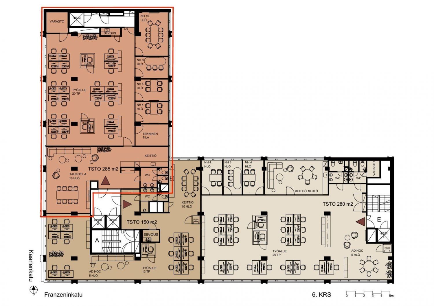 Monipuolinen toimistotila kuudennessa kerroksessa. Tässä tilassa on sekä avokonttoria että huoneita. Taukotila keittiöineen sekä toimiston sisääntulo on erotettu seinällä työskentelytiloissa, joten töitä saa tehdä rauhallisessa ympäristössä. Tilassa on omat wc:t.