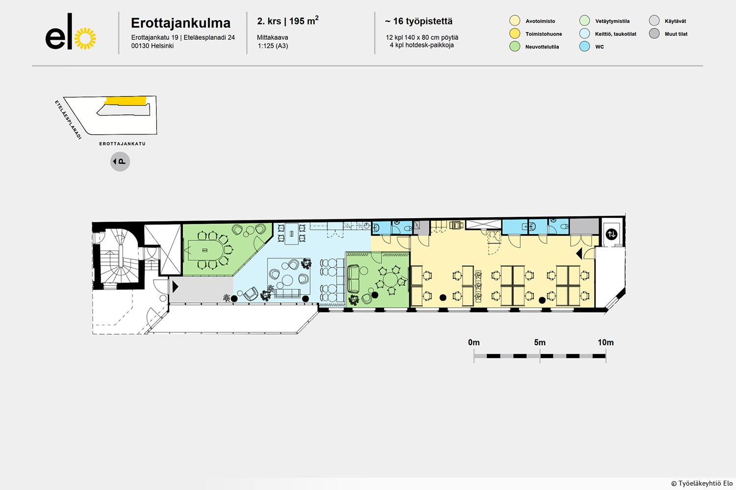 Toimistotilaa arvokiinteistössä Helsingin ydinkeskustassa. Helsingin keskustan kolmen pääakselin – Mannerheimintien, Esplanadin ja Bulevardin – risteyksessä sijaitseva Erottajankulma suunniteltiin palatsimaiseksi asuin- ja liikerakennukseksi. Vuonna 1893 vuonna valmistunut arvokiinteistö on täynnä koristeellisia ja pysäyttäviä yksityiskohtia. Rakennuksen upean korosteelliset porrasaulat ja julkisivut on kunnostettu alkuperäistä ulkoasuaan kunnioittaen. Kiinteistöä ja toimitiloja muokataan asiakkaiden tilatarpeita vastaavaksi ja hyödyntäen nykyaikaista talotekniikkaa, mm. jäähdytetyn ilmanvaihdon osalta. Kiinteistön viihtyisä sisäpiha tarjoaa hengähdyshetken koristekirsikkapuiden varjossa. Kiinteistössä on toimistotiloja, liiketiloja sekä ravintola.