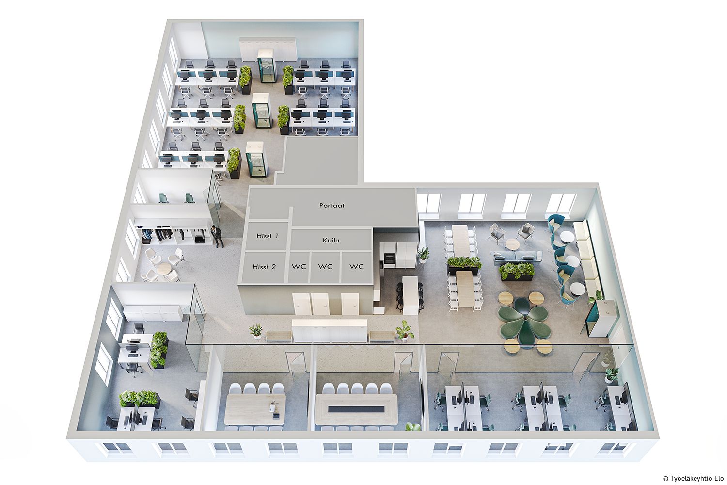 Ylimmän toimistokerroksen monien mahdollisuuksien toimitila keskeisellä sijainnilla. Tämä toimistotila muokataan tulevan käyttäjän tarpeita vastaavaksi nykyaikaiseksi kokonaisuudeksi. Tilaan saadaan luotua upea loungekahvila-alue, jossa henkilökunta voi kokoontua ja viettää aikaa. Työhuoneita ja tiimityötiloja, neuvottelu- ja vetäytymistiloja sekä avotyöalueita yhdistelemällä saadaan yrityksellenne sopiva työympäristö.
