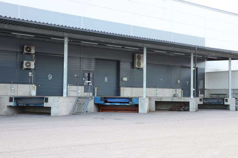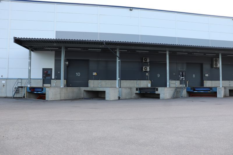 Varasto 1 201 m²: vapaa korkeus 8 m, nosto-ovet lastauslaiturilla