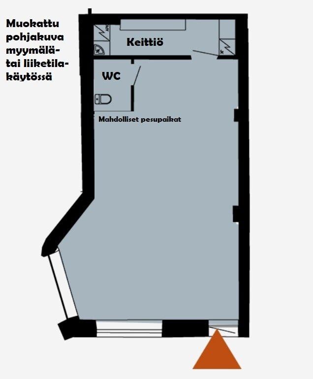 Tilassa nyt avotilaa, huone, keittiö ja wc. Tilaa voi avartaa huoneen osalta ja varmasti pesupaikka/vesipistekin onnistuu esim. kampaamon tai kynsihoitolan liiketoimintaa varten. Tila remontoidaan tulevalle käyttäjälle.