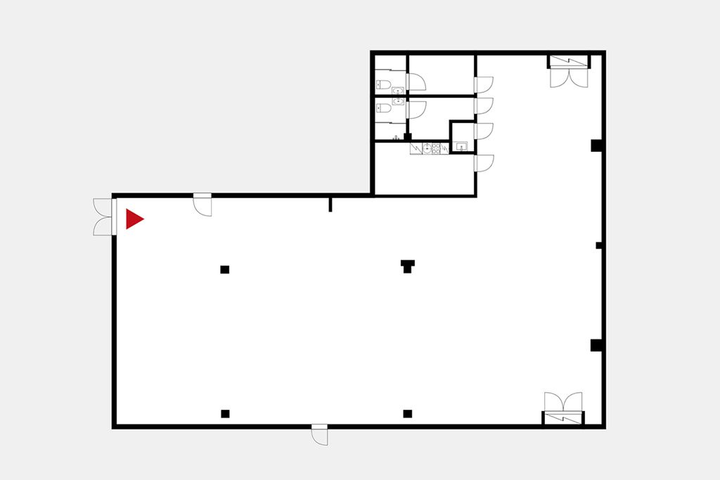 Tämä 360m2 liiketila sijaitsee kiinteistön 2.kerroksessa. Tila on pääosin avonainen, ja siihen kuuluu omat keittiö- ja wc-tilat. Tila soveltuu myös toimisto- tai liikuntakäyttöön. Tila on aikaisemmin toiminut valokuvausstudiona.
