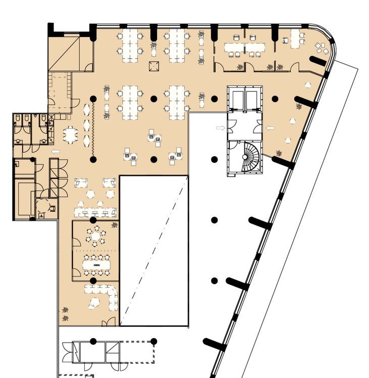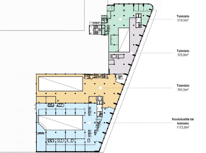 Tilakokonaisuus mahdollistaa joustavasti toimistotilan rakennuksen yrityksen tarpeisiin. Kokonaisuudessa voidaan hyödyntää avointa aulatilaa sekä kokoustamiseen tai työskentelyyn rauhoitettuja huoneita.
