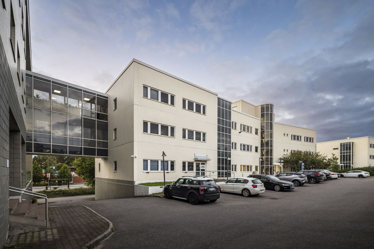 Espoon Friisilässä sijaitseva kiinteistö on osa kolmen erillistalon muodostamaa harmonista kokonaisuutta. Toimistotalossa on valoisaa työskentelytilaa.