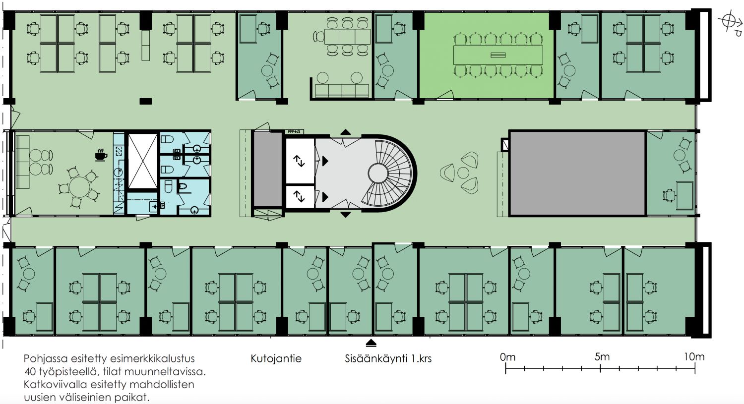 Kiinteistössä on yhteiset suihku- ja pukeutumistilat mm. pyörällä töihin tuleville. Kiinteistön toimistotilat ovat helposti muokattavissa käyttäjien tarpeisiin sopiviksi.