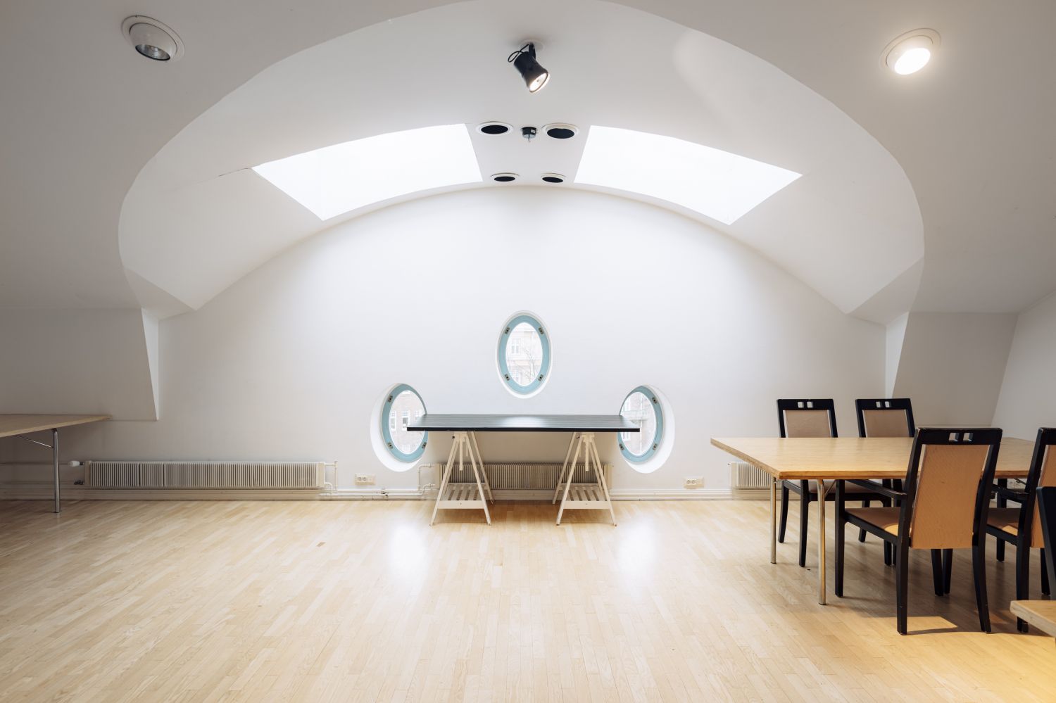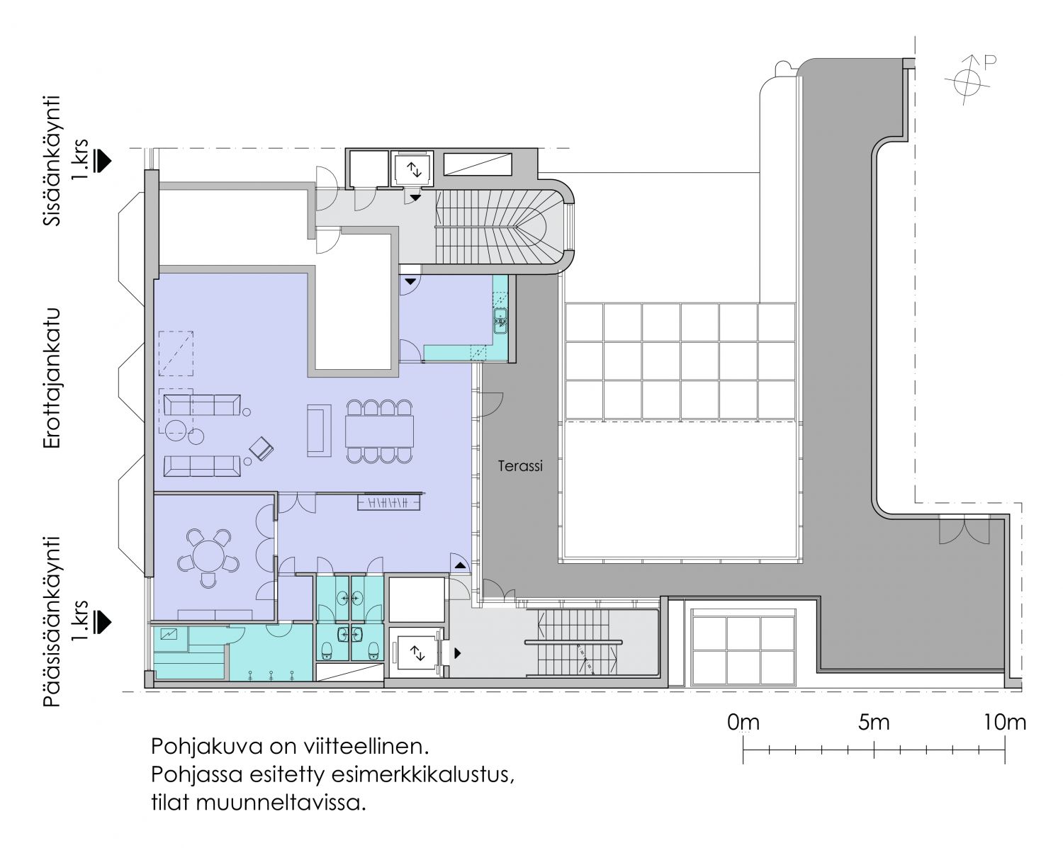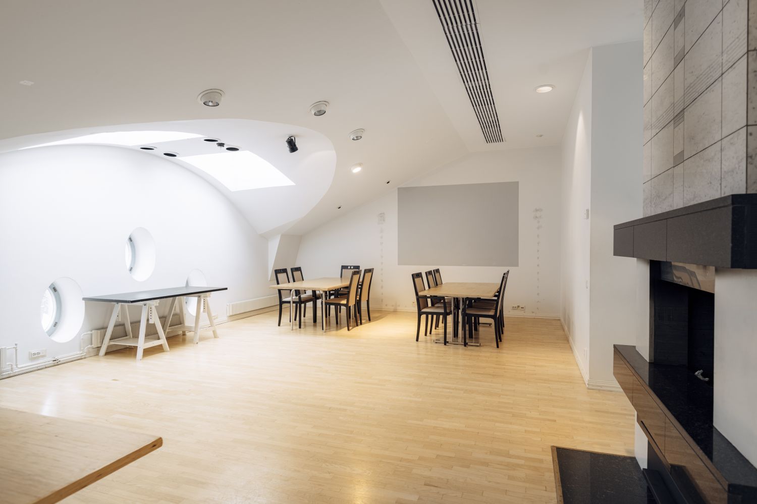 Ylimmän kerroksen liiketila saunalla ja suurella 137m² terassilla. Tila soveltuu nykyisellään esimerkiksi juhla- ja edustustilaksi. Tila on mahdollista muuttaa myös upeaksi ja uniikiksi toimistotilaksi.
